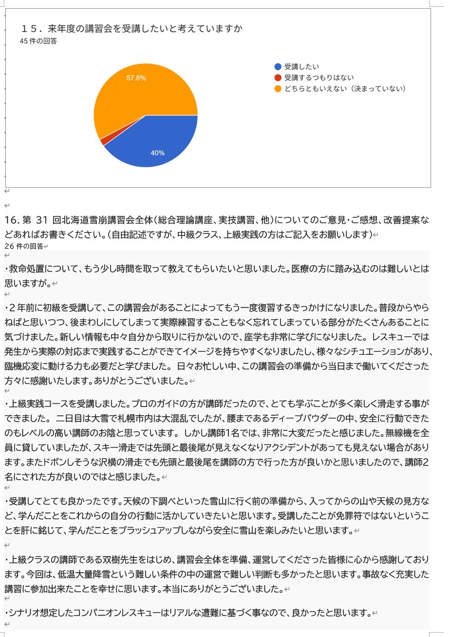 第31回北海道雪崩講習会が無事終了しました。 投稿日時: 2026年3月1日 投稿者: kenkyuadmin 2月7日8日の道北校の実習講習会を最後に、昨年11月の理論講座から始まった第31回北海道雪崩講習会の無事に終了することができました。 特に運営に携わっていただいた方々、及び講師陣のみなさんには大変お世話になりました。 2月19日に開催されたテレビ塔での解散式にて決算も了承されすべての日程が終了しました。 3月は雪崩事故が多い月ですので、引き続きリスクマネジメントを徹底して雪山を楽しんでください。 受講生からいただいたアンケート結果を分析して、来年度以降の講習会に役立てたいと思います。